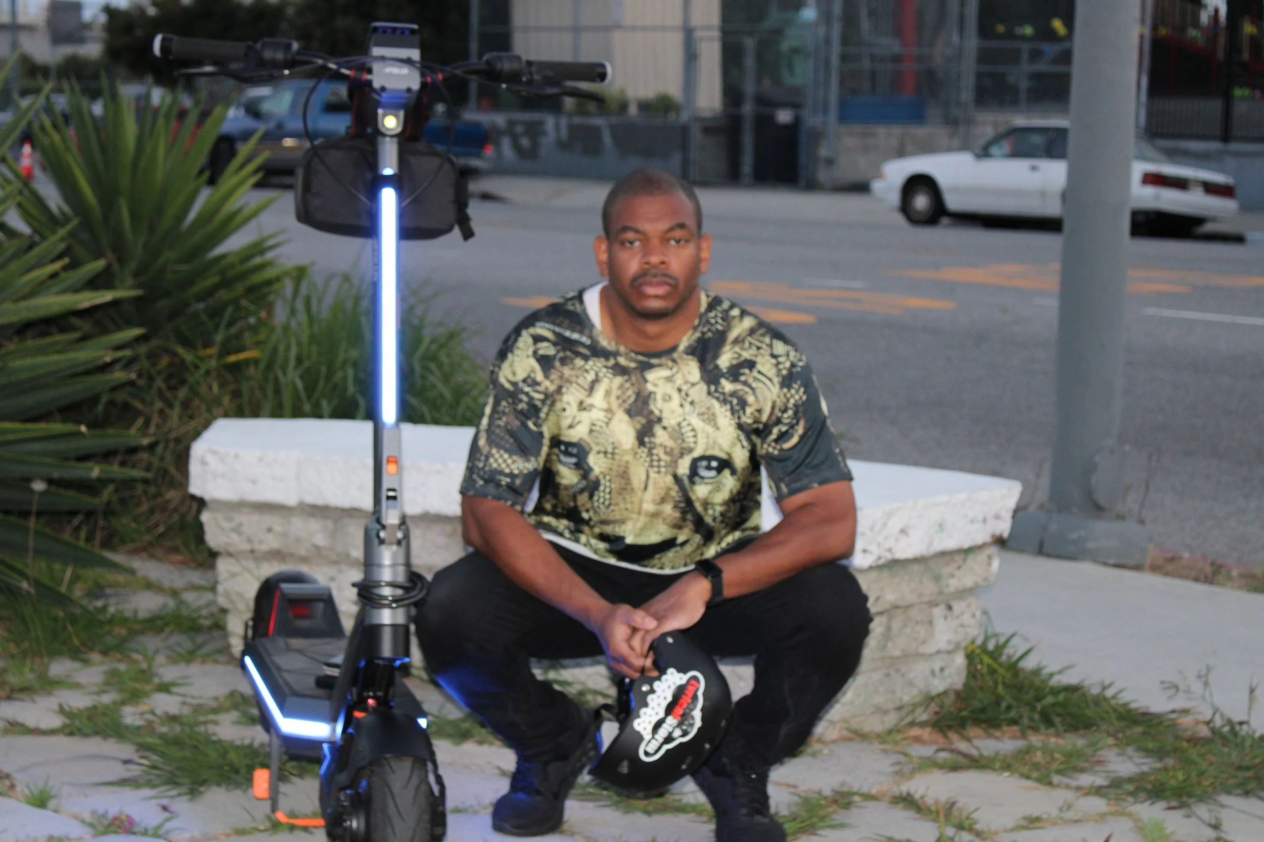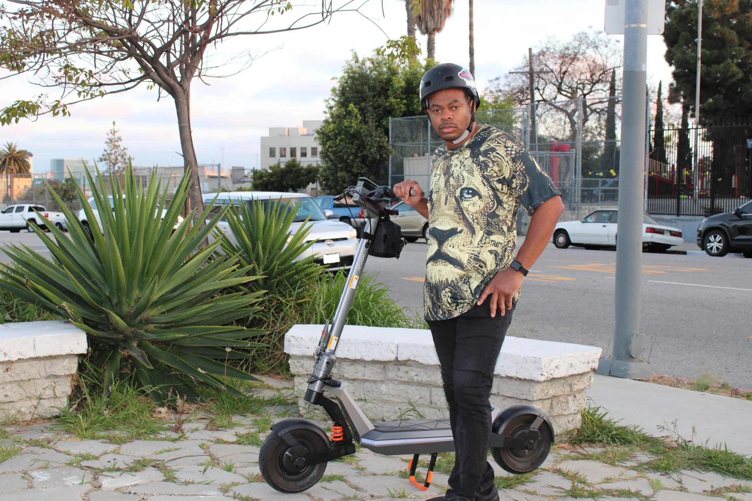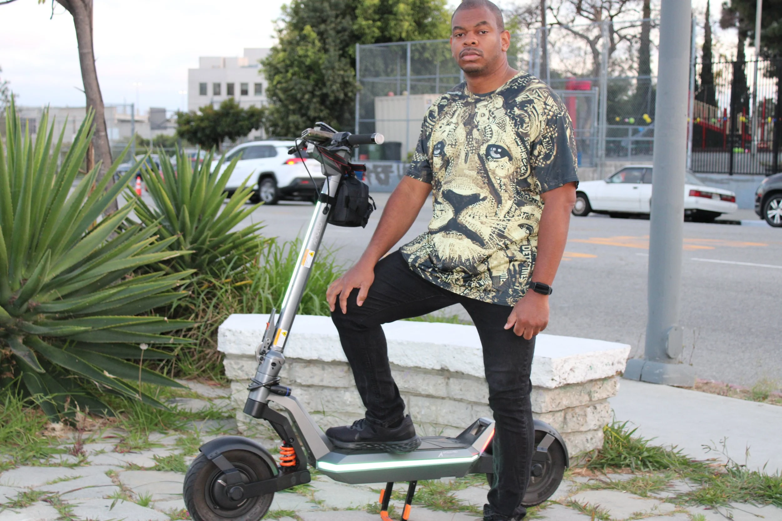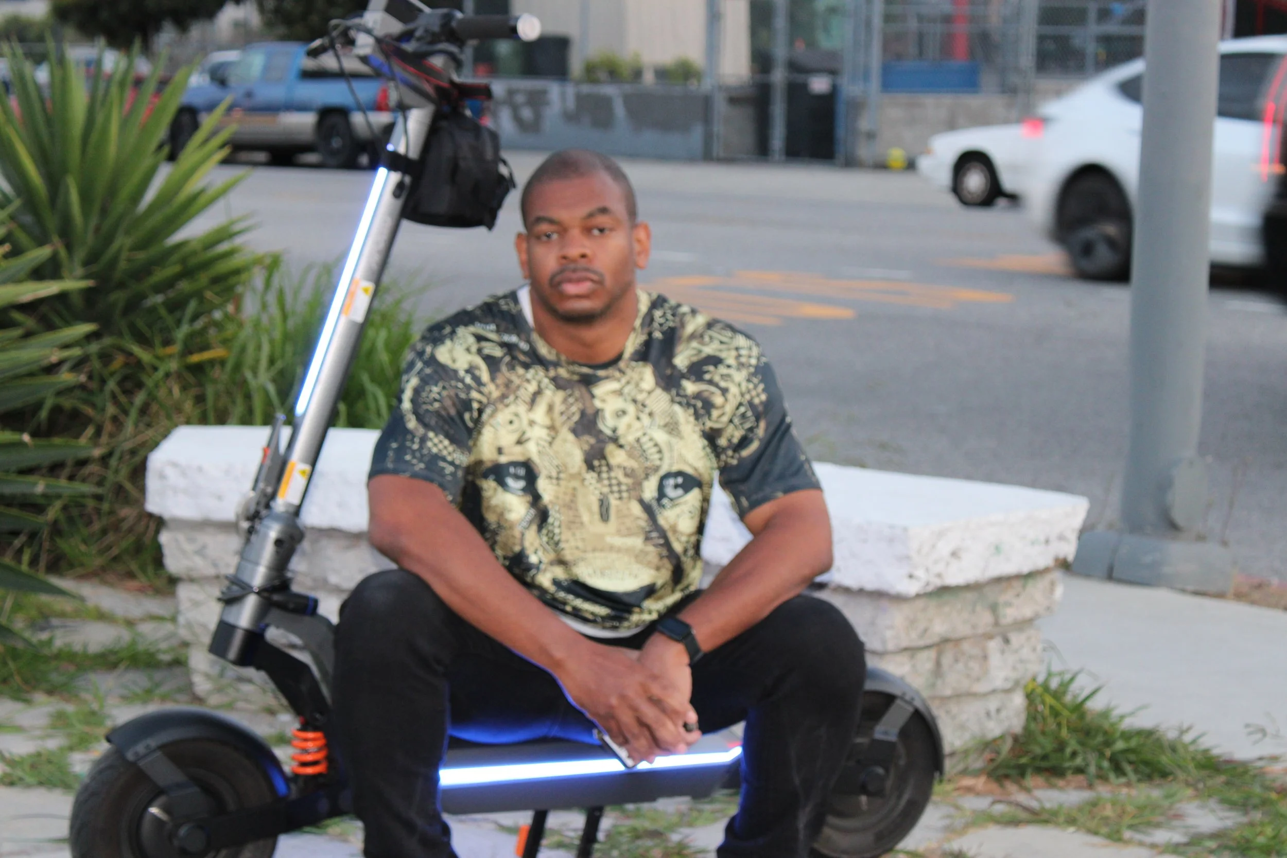 To those late to the party gas prices are the latest fuckery to mankind. I haven't owned a gas transportation vehicle since my late 20's. My goal is to own only electric motor transportation moving forward, and right now I own 4 EV scooters. Not trying to own every scooter on the market, but I feel these will go great with a Tesla in do time. My two favorite rides for now are my Varla Pegasus and Apollo Pro. Both scooters have dual motors that go fairly fast for inner city commutes. Currently the Varla Pegasus is under $900.00USD, and the Apollo Pro is $3,600 USD. The focus on this photo shoot is definitely the Apollo Pro, but my outfit is the wardrobe I wore for my upcoming last album 'Disrespectful.' Big thanks to Light In The Box for the lion shirt design, and Kings outlet store in Baldwin Hills mall.
