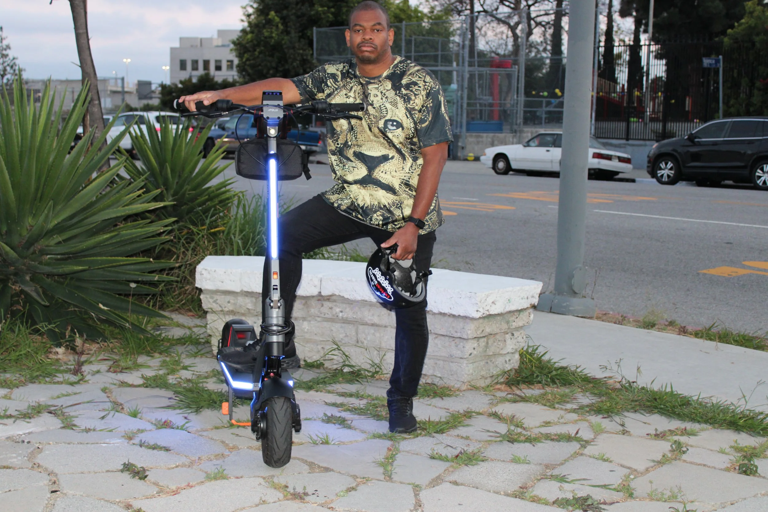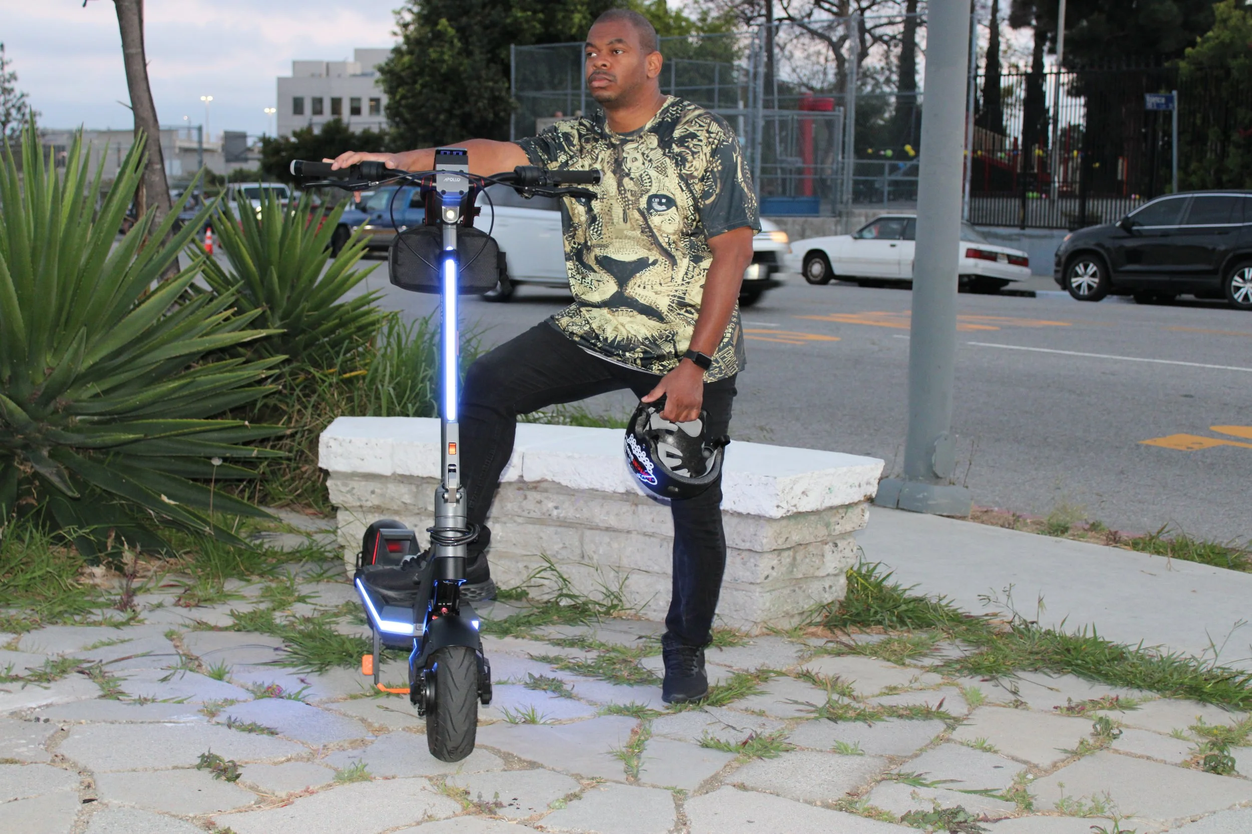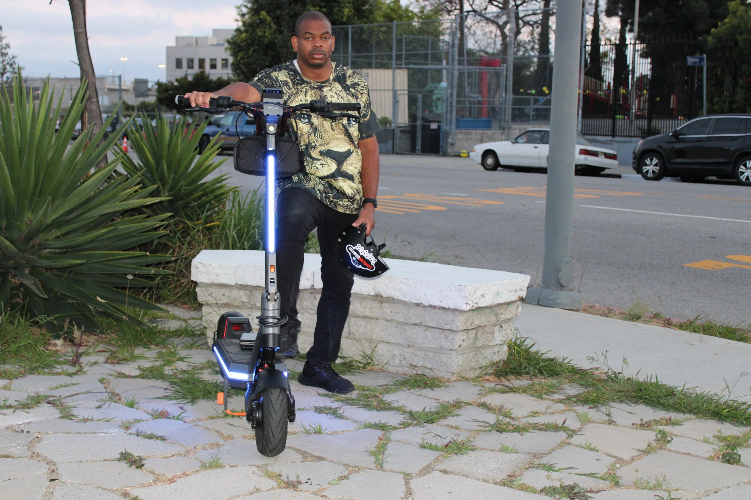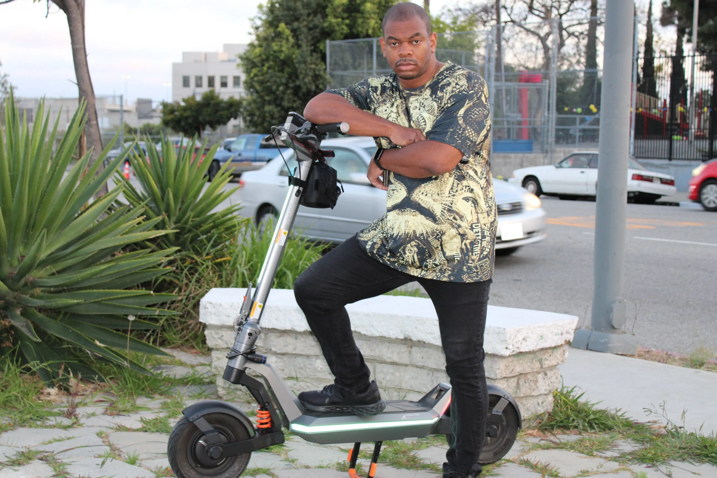 To those late to the party gas prices are the latest fuckery to mankind. I haven't owned a gas transportation vehicle since my late 20's. My goal is to own only electric motor transportation moving forward, and right now I own 4 EV scooters. Not trying to own every scooter on the market, but I feel these will go great with a Tesla in do time. My two favorite rides for now are my Varla Pegasus and Apollo Pro. Both scooters have dual motors that go fairly fast for inner city commutes. Currently the Varla Pegasus is under $900.00USD, and the Apollo Pro is $3,600 USD. The focus on this photo shoot is definitely the Apollo Pro, but my outfit is the wardrobe I wore for my upcoming last album 'Disrespectful.' Big thanks to Light In The Box for the lion shirt design, and Kings outlet store in Baldwin Hills mall.
